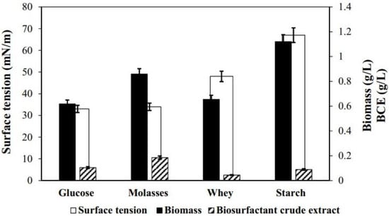 Surface tension (white bars), biomass (black bars), and biosurfactant crude extract (BCE, gradient-filled bars) production in glucose, molasses, whey, and starch by Bacillus subtilis DS03 growth. Note the difference in y-axis scales between surface tension against biomass and BCE.