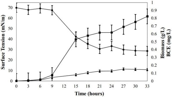 Time course of biosurfactant crude extract (BCE, ▲) production, surface tension (●), biomass (■) production in molasses medium by B. subtilis DS03. Note the difference in y-axis scales between surface tension against biomass and BCE.
