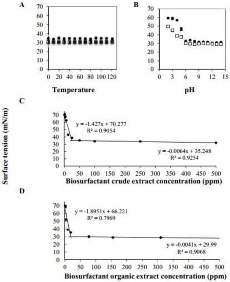 Surface tension against temperature (A), pH (B) for biosurfactant crude extract concentr− ation (BCE, white square) and biosurfactant organic extract concentration (BOE, ●). Critical micelle concentration of BCE (C) and BOE (D).