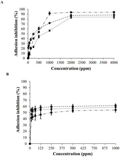 Adhesion inhibition response using BCE in pre-treatment (A) and post-treatment (B) against Escherichia coli (●), Staphylococcus aureus (X), and Listeria monocytogenes (○).
