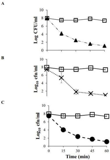 Reduction in cell viability (CFU/mL) versus time for (A) Escherichia coli (▲), (B) Staphylococcus aureus (X), (C) Listeria monocytogenes (●) and control (white square).