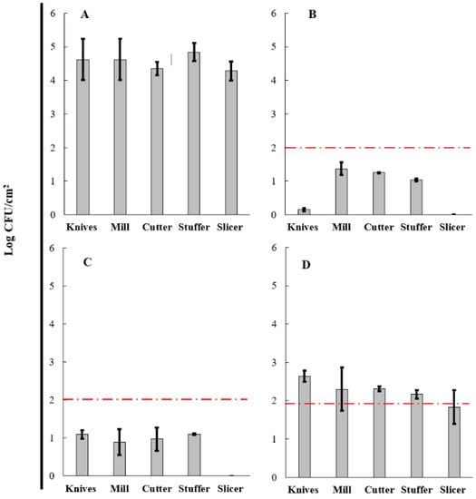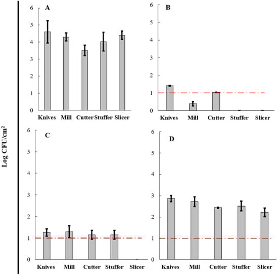 Aerobic mesophilic profile of knives, mill, cutter, stuffer, and slicer used during sausage production. Initial load before the cleaning process (A) and after the cleaning process using COP-A (B), COP-B (C), and COP-C (D). The limit established is shown in a red line.