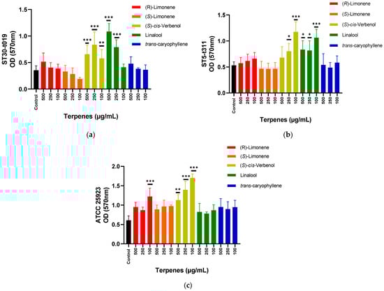For the ST30-t019 isolate, an inducing effect on biofilm formation was observed using the compound (S)-cis-Verbenol at the three concentrations tested. The linalool compound showed this inducing effect at 500 and 250 μg/mL (Figure 1a). In the case of the ST5-t311 isolate, an inducing effect was observed with (S)-cis-Verbenol at 250 and 100 μg/mL and with Linalool at 500, 250, and 100 μg/mL (Figure 1b). For the ATCC strain, an inducing effect was also registered with (S)-cis-Verbenol at the three concentrations tested and (R)-(+)-Limonene at 100 μg/mL (Figure 1c).