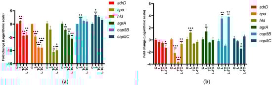 Effect of Linalool, (−)-trans-caryophyllene and their combination on gene expression of sdrD, spa, hld, agrA, cap5B, cap5C in ST5-t311 isolate (a), and ATCC 25923 (b). The average of three measurements and the standard deviation are presented in each case. The effect of each concentration is compared with respect to control (one-way ANOVA, Dunnett’s post hoc test) * p < 0.05, ** p < 0.01, and *** p < 0.001 indicate significance. C—control; Lin—Linalool; TC—(−)-trans-caryophyllene.