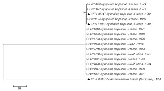 The 101 strains belonging to Xylophilus ampelinus held in CIRM-CFBP were isolated all from grapevine plants, over a period of 35 years in Greece, France, Spain and South Africa. The most recent strains present in the collection were isolated in 2001. The strains are preserved as freeze-dried or in sterile water with 40% glycerol at −80 °C or in liquid nitrogen at −196°C. For routine cultivation, the strains are plated on YPGA (yeast extract 7 g.L−1; bacto peptone 7 g.L−1; glucose 7 g.L−1; agar 15 g.L−1) for 4 days at 25 °C. The type strain of Acidovorax anthurii CFBP 3232T was added in this study as an outgroup. Both species X. ampelinus and A. anthurii belong to the Comamonadaceae family. All strains information is listed in the Supplementary Materials, Table S1. All strains listed in Table S1 are preserved at CIRM-CFBP (https://cirm-cfbp.fr, (accessed on 26 July 2022)) and are available upon request for the international scientific community.