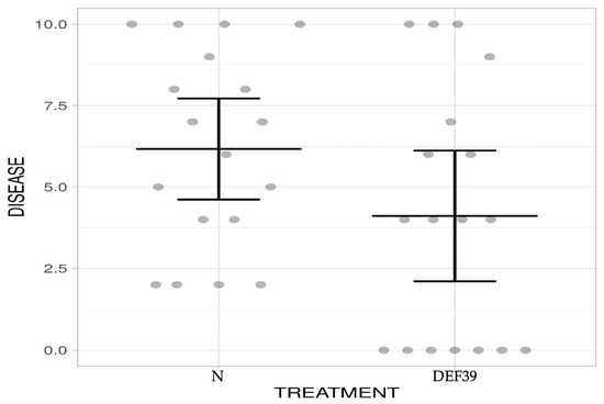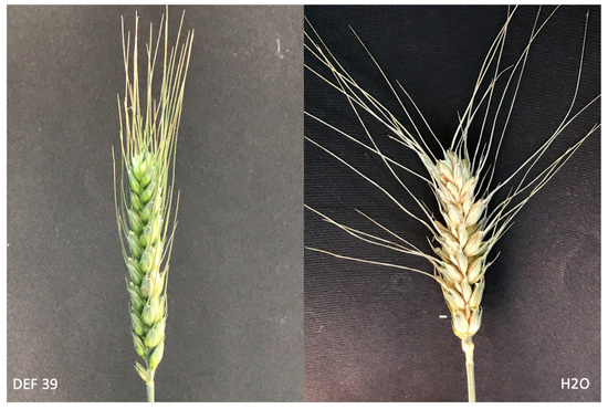 Figure 2. FHB disease severity of wheat bacterized and not with DEF39: Disease assessment was conducted four weeks after spraying Fusarium graminearum conidia onto the spikes (p-value < 0.043, Mann–Whitney U test).