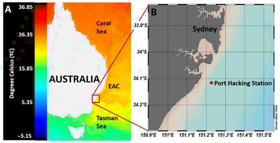 Location of the sampling site. (A) Satellite image of the sea surface temperature of the east coast of Australia on 14 April 2019 showing the location of Sydney basin and the position of the EAC relative to the Tasman and Coral Seas (modified from IMOS []). (B) Magnified inset image showing the location of Port Hacking station. Generated with Ocean Data View software [].
