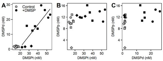 Correlations between the different DMSP concentrations. Control samples (light grey) and enriched DMSP samples (black) for time 0 h (circles), 3 h (squares), and 6 h (diamonds) are represented for DMSPd vs. DMSPt (A), DMSPp vs. DMSPt (B), and DMSPp vs. DMSPd (C). Significant correlation: (A) r2 = 0.668, p = 0.002.