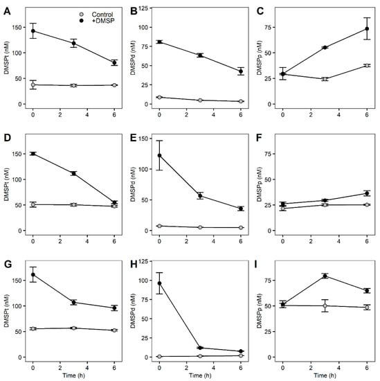 DMSP concentrations of fractionated marine microbial community over 6 h. Top: >8 µm fractioned samples (DMSPt (A), DMSPd (B), DMSPp (C)), middle: 3–8 µm fractioned samples (DMSPt (D), DMSPd (E), DMSPp (F)), bottom: 0.22–3 µm fractioned samples (DMSPt (G), DMSPd (H), DMSPp (I)) for control samples (light grey) and +DMSP samples (dark grey).