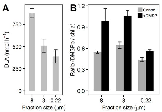 DLA and DMSPp at the final time point. (A) DLA for each fraction of the community at the final time point. (B) DMSPp concentrations normalized to chlorophyll a for control samples (light grey bars) and +DMSP samples (dark grey bars) for each fraction of the community at the final time. Data represent the mean ± standard deviation (n = 4). ANOVA, 8 µm: F = 14.748, p = 0.012; 3 µm: F = 14.777, p = 0.012; 0.22 µm: F = 12.818, p = 0.023.