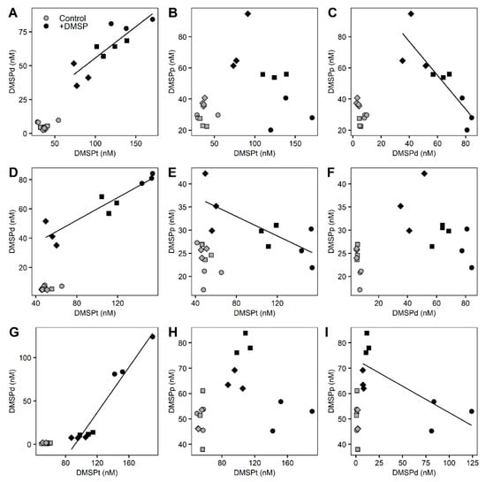 Correlations between the different DMSP concentrations for the fractionated marine microbial community. Control samples (light grey) and enriched DMSP samples (black) for time 0 h (circles), 3 h (squares), and 6 h (diamonds) are represented. Top row: >8 µm fraction (A–C), middle row: 3–8 µm fraction (D–F), bottom row: 0.22–3 µm fraction (G–I). Significant correlations: (A) r2 = 0.722, p = 0.0019; (C) r2 = 0.746, p = 0.0027; (D) r2 = 0.861, p = 0.0003; (E) r2 = 0.565, p = 0.0195; (G) r2= 0.942, p = 0.01; (I) r2 = 0.551, p = 0.02.