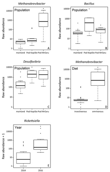 Significantly different abundant taxa detected with Analysis of Composition of Microbiomes (ANCOM) The analysis was performed on unrarefied OTUs with a relative abundance higher or equal to 1% across the whole data set. Significant taxa at p < 0.05 after Benjamini–Hochberg correction. (A) Differences in the abundance of Methanobrevibacter between populations, with lizards from Pod Mrčaru showing higher abundance; (B) detected differences across populations in the abundance of Bacillus, with a higher abundance in the lizards from Pod Kopište; (C) detected differences across populations in the abundance of Desulfovibrio showing a higher abundance in lizards from both islands; (D) differences between dietary groups in the abundance of Methanobrevibacter, being more abundant in the omnivorous lizards; (E) differences between the year of sampling in Rickettsiella with 2016 showing a higher abundance.