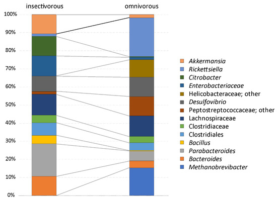 Mean relative abundance composition of lizard gut microbiota in lizards with a different diet. The analysis was performed on the unrarefied OTU table with OTUs, showing a relative abundance higher than or equal to 1%.