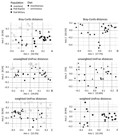 Principal coordinate analyses of rarefied lizard gut microbiota beta diversity from individuals with different diets and from different localities. (A) principal coordinate analysis of Bray–Curtis distance across all three populations; (B) principal coordinate analysis of unweighted UniFrac distances across all three populations; (C) Principal coordinate analysis of weighted UniFrac distances across all three populations; (D) principal coordinate analysis of Bray–Curtis distances including only lizards from the mainland and Pod Kopište; (E) Principal coordinate analysis of unweighted UniFrac distances including only lizards from the mainland and Pod Kopište; (F) principal coordinate analysis of weighted UniFrac distances including only lizards from the mainland and Pod Kopište. Each point represents a sample from an individual lizard. Circles represent lizards from the mainland (Split), triangles represent lizards from Pod Kopište, and squares represent lizards from Pod Mrčaru. Open symbols represent omnivorous lizards and filled symbols represent insectivorous lizards.