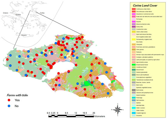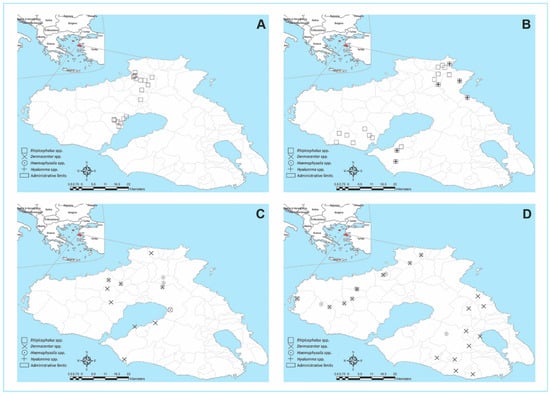 - Chaligiannis, I.; Musella, V.; Rinaldi, L.; Cringoli, G.; de la Fuente, J.; Papa, A.; Sotiraki, S. Species Diversity and Spatial Distribution of Ixodid Ticks on Small Ruminants in Greece. Parasitol. Res. 2016, 115, 4673–4680. [Google Scholar] [CrossRef] [PubMed]