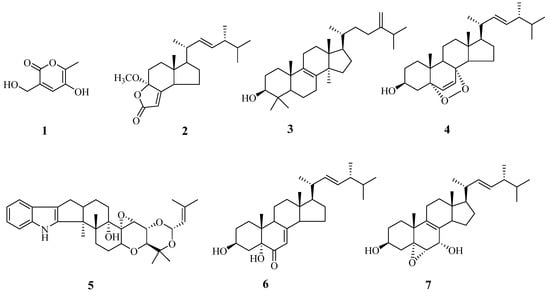Compounds 2–7 were determined to be (17R)-17-methylincisterol (2) [19], eburicol (3) [20], ergosterol peroxide (4) [21], terpendole C (5) [22], (3β,5α,9β,22E)-3,5-dihydroxy-ergosta-7,22-dien-6-one (6) [23] and 5α,6β-epoxy-(22E,24R)-ergosta-8,22-diene-3β,7α-diol (7) [24]. Their structures are shown in Figure 3.
