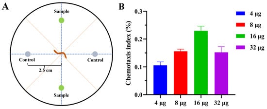 Effect of compounds on the chemotaxis of P. redivivus. (A) Schematic representation of the quadrant bioassay used to measure the chemotaxis of compounds. (B) Chemotaxis activity of 1 at different concentrations.