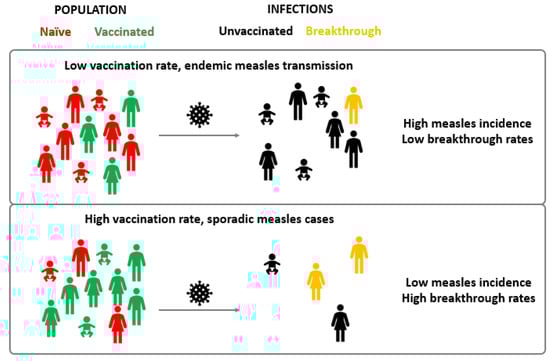 Measles breakthrough cases in countries with endemic or sporadic measles transmission. In populations where the majority of individuals are naïve, MV can circulate endemically and most of the infected individuals will be unvaccinated subjects (top). On the other hand, in populations with high vaccination coverages (and lower MV circulation), the number of vaccination failure cases among susceptible individuals will be higher and so will be the proportion of breakthrough cases (bottom).