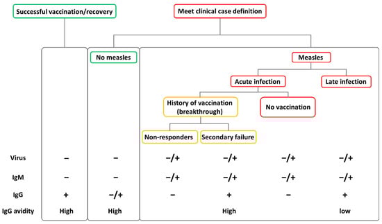 The best method to differentiate breakthrough infections is the presence or absence of type G immunoglobulins (IgG), which develop later during the infection and persist for long periods of time, and the avidity enzyme immunoassay, which allows to differentiate a recent (low avidity IgG) from a past (high avidity IgG) infections [49] (Figure 3). During the acute phase of a breakthrough infection, non-responders are recognized by the absence of IgG or, during a post-acute stage of the infection (beyond 10 days), by the presence of IgG of low avidity as the only antibodies detectable in these individuals are those produced during the reinfection. Individuals with a secondary vaccination failure are characterized by the presence of high-avidity IgG during the acute infection phase as these patients possess IgG from past infections that, however, did not protect them from a reinfection. Both non-responders and secondary vaccine failure cases can develop IgM during the reinfection. Notably, subjects with low post-vaccination antibody titers could still maintain protective antibody levels and have an adequate response against MV infection [46].