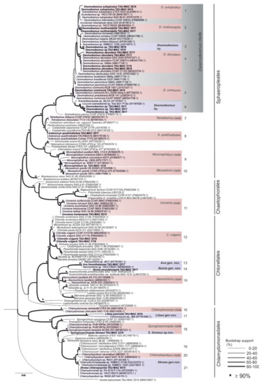 New taxa and lineages of green algae are discovered every year, due to the use of molecular tools in combination with the traditional morphological taxonomy. For many years the identification of microscopic green algae was mainly based on the recognition of morphological characteristics such as the shape of the cells, position of chloroplasts, presence or absence of pyrenoids, and type of reproduction [1]. The lack of obvious traits, the high degree of variability of some of the observable features of species, and the phenotypic plasticity that several microorganisms exhibit led to a large number of misidentifications and difficulties in the delimitation of species [2,12,13]. Thus, the combination of approaches thrived among phycologists since more robust results could be obtained [7,14] and that led to a total revision of taxonomic lineages such as classes, orders, and families [15].