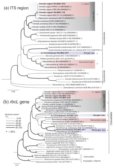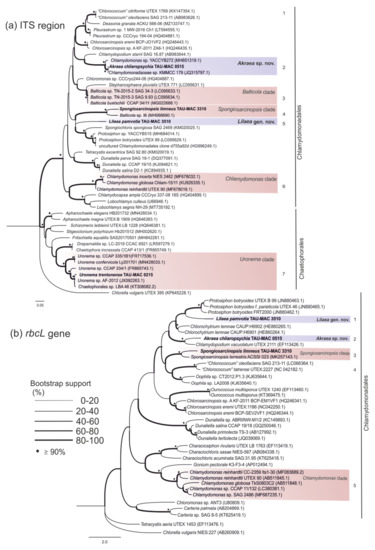 Phylogenetic relationships of the Chlamydomonadales TAU-MAC strains based on (a) ITS region (c. 500bp) and (b) rbcL gene (c. 1050bp) genes. Line thickness at branches (see explanation in figure) represents bootstrap support values (bootstrap support for ML and MP analysis). The numbers in parentheses are GenBank accession numbers.