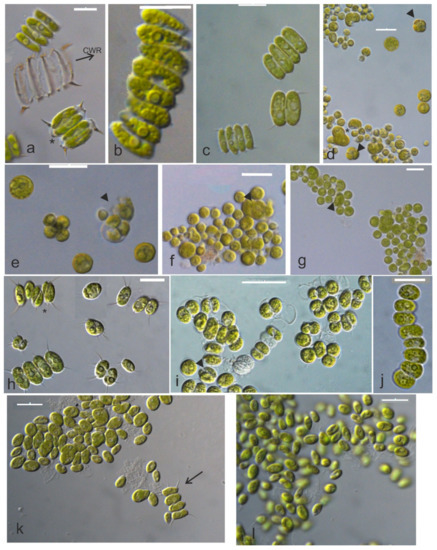 - Fawley, M.W.; Dean, M.L.; Dimmer, S.K.; Fawley, K.P. Evaluating the Morphospecies Concept in the Selenastraceae (Chlorophyceae, Chlorophyta). J. Phycol. 2006, 42, 142–154. [Google Scholar] [CrossRef]