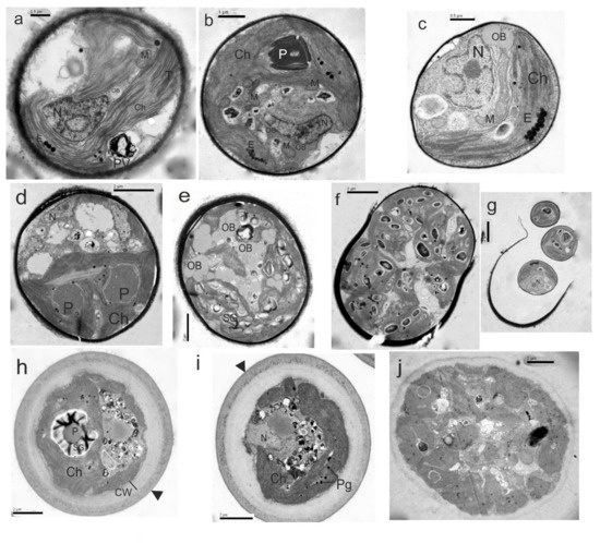 Electron micrographs of strains Spongiosarcinopsis limneus TAU-MAC 3310 (a,b), Lilaea pamvotia 3510 (c–g), Akraea chliaropsychia 0515 (h–j); (a,b): mature cells with eyespot, and pyrenoid surrounded by starch. (c: mature cell with eyespot. (d): cell with two pyrenoids in the chloroplast. (e): aging cell accumulating starch grains and oil bodies. (f): autosporangium with numerous autospores. (g): release of autospores. (h,i): mature cells covered with mucilaginous sheath (arrowheads). (j): autosporangium with numerous autospores. Ch, chloroplast; CW, cell wall; E, eyespot; M, mitochondrion; N, nucleus; OB, oil body; P, pyrenoid; Pg, plastoglobuli; PV polyphosphate vacuole; SG, starch grain; T, thylakoids.
