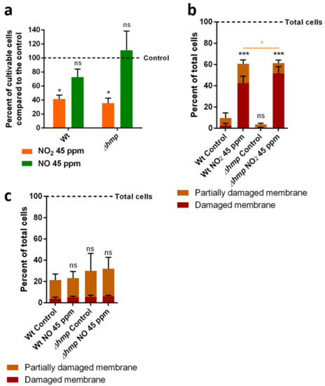 Considering the transcription increase in hmp in both the NO2 and NO conditions, its impact on the bacterial physiology in response to these RNS was studied using a deletion mutant (Δhmp). The growth rate of the wild-type and the Δhmp mutant are identical (data not shown). While the cultivability of both the wild-type (WT) and deletion mutant decreased after exposure to NO2, no significant difference was found between the two (Figure 2a). However, the amount of partially damaged cells in response to NO2 was decreased in favor of the damaged cells (Figure 2b). No difference was found between the control cells and the cells exposed to NO (Figure 2c)