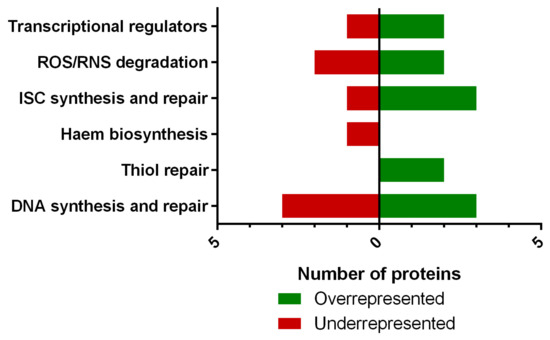 Three proteins involved in the degradation of oxidative and nitrosative stress mediators were modulated after exposure to NO2. The catalase KatE was under-represented by a 7.8-fold, while a peroxyredoxin of the AhpC family was over-represented by 2.1-fold and the thiol peroxidase Tpx was over-represented by 3.7-fold. While these three proteins both convert the dangerous hydrogen peroxide into water and oxygen, KatE possesses an ISC, while AhpC and Tpx do not. The shift between KatE and Tpx/AhpC family peroxyredoxin could therefore be a way to avoid the use of ISCs in this process, to both limit the number of ROS-inducing Fenton reactions and redirect the use of functional ISCs to other processes. In addition, NirB, a subunit of the nitrate reductase NirBD containing an ISC was also under-represented after exposure to NO2 by a 3.3-fold.