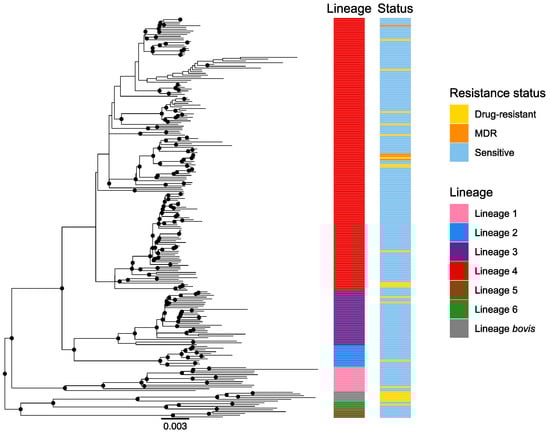 Global phylogeny of 227 whole-genome sequenced MTBC strains. The color codes are: pink—lineage 1, blue—lineage 2, purple—lineage 3, red—lineage 4, brown—lineage 5, green—lineage 6, gray—M. bovis lineage. The resistance status is represented for each strain with the following color code: blue—susceptible strains, yellow—strains resistant to one of the first-line drugs, orange—MDR strains (resistance to rifampicin and isoniazid). Only resistances to first-line TB drugs were considered here. MDR: multidrug-resistant.
