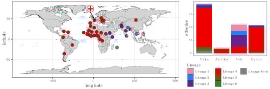 Our study focused on a single urban laboratory in a department with an incidence rate three times higher than in other French departments. We found a high level of diversity for the strains isolated in our laboratory, with, as expected, a majority of strains (68%) belonging to the Euro-American lineage. Interestingly, when mapped according to patients’ geographical origins, the lineage distribution is in line with the known global TB diversity (Figure 2) [,,]. These results suggest that the patients were infected in their country of origin by local MTBC strains. Indeed, because TB can be a latent disease for decades, the population in cosmopolitan centers could have been contaminated by MTBC strains in their region of birth. As a consequence, the host’s region of origin is predictive of the strain of TB carried by the host, and this association between host and pathogen populations appears to be highly stable []. The local geographic diversity of MTBC lineages was probably dictated by the composition of the local immigrant population. However, the transmission of a circulating strain belonging to a specific lineage within a community cannot be excluded. Our lineage distribution was different from that found in the study of Pierre-Audigier et al. []. This discrepancy could be explained by the ethnical differences of the populations living in these areas. A study on a larger scale with strains from different regions of France could help us to better understand the influence of ethnicity on the proportion of lineages found in each territory.