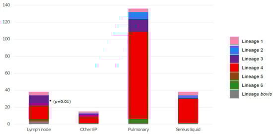 Then, we considered the distribution of different lineages according to the type of sample from which the strains were taken in order to see if there was an association between a specific lineage and the clinical manifestations of TB. In this context, samples have been classified as follows: pulmonary (bronchial aspiration, bronchoalveolar fluid, sputum, gastric tube), lymph node, sereus fluids (cerebrospinal fluid, pleural fluid, peritoneal fluid, ascites fluid and pleural) and other extrapulmonary samples (bone, cutaneous, urine, genital and blood samples). Interestingly, the East-African-Indian lineage 3 was significantly associated with lymph node TB (p = 0.01) (Figure 3).