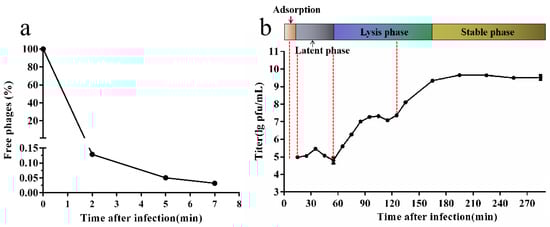 The life-cycle of phage SA1 against S. lentus JTB1-3. (a) Adsorption curve of SA1 to its host S. lentus JTB1-3. Free phage (%) = the number of free phages after infection/the number of free phages without infection. After incubation for 5 min, free phages accounted for only 0.05% of phages in total. (b) One-step growth curve of phage SA1 after incubation for 5 min. The data are expressed as means ± SD (n = 3).