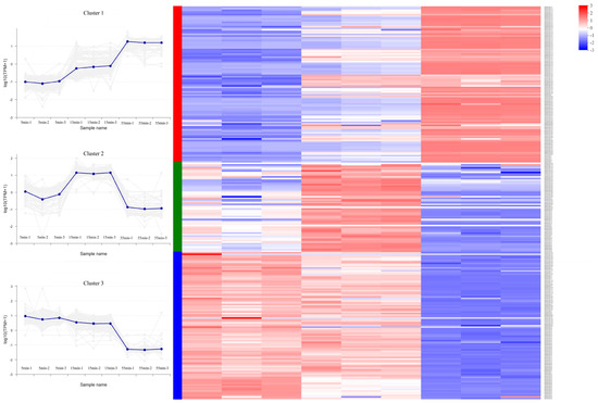 Transcriptomic profile of SA1 genes in the host S. lentus JTB1-3. Cluster analysis was performed using the online tool of Majorbio Cloud Platform (https://cloud.majorbio.com/page/tools/, accessed on 30 March 2022) to cluster a total of 259 genes (2 to 260) based on their TPM values and K-means method. Cluster 1: late genes. Cluster 2: middle genes. Cluster 3: early genes.