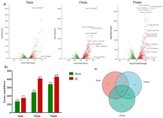 The DEGs of the host during infection at a MOI of about 10 were analyzed to study the responses to phage infection. According to the expression level, genes with |log2FC| ≥ 1 and q < 0.05 were classified as DEGs. Compared with the uninfected samples, DEG totals of 10.9% (303/2790), 23.0% (643/2790), and 27.2% (760/2790) were found at 5 min, 15 min, and 55 min after SA1 infection, respectively. The number of DEGs rose with time in response to phage infection, with more DEGs being upregulated than downregulated at all periods (Figure 3a,b). It is important to note that the sum of the DEG at each timepoint was not equal to the overall number of DEGs (997, not 1706) because specific genes were differentially expressed at several timepoints (Figure 3c). Approximately 64.27% (1796/2790) of the host S. lentus genes were stably expressed during phage SA1 infection (|log2FC|1 or q > 0.05), indicating that only a tiny portion of the bacterial resources was required for SA1 propagation.