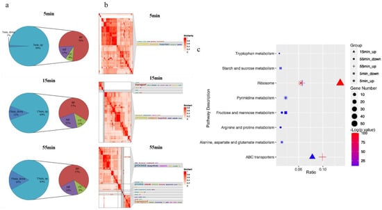 To obtain a more thorough understanding of the gene functions of the DEGs, GO and KEGG functional annotations were performed on upregulated and downregulated DEGs at each timepoint. The GO analysis showed that the DEGs had a significant functional enrichment in three stages. Although the number of upregulated and downregulated DEGs at the same time after infection did not significantly differ, the GO enrichment of the upregulated DEGs was more notable than that of the downregulated DEGs (Figure 4a). In addition, the GO enrichment suggested that the DEGs had a significant functional classification in three stages, among which biological processes (BP) were the most frequent (Figure 4a). Therefore, we used SimplifyEnrichment to visualize the upregulated DEGs involved in the biological processes at three stages after infection [] (Figure 4b). At the eclipse phase (5 min), the upregulated DEGs were enriched to 104 BP terms, mainly related to nucleoside phosphate biosynthesis and metabolism, pyrimidine nucleoside phosphate biosynthesis and metabolism, peptide biosynthesis/metabolism, and translation. At the intracellular accumulation phase (15 min), the upregulated DEGs were enriched to 81 BP terms, mainly related to amide biosynthesis and metabolism, transmembrane transport, and protein metabolism. At the lysis process (55 min), the upregulated DEGs were enriched to 75 BP terms, mainly related to peptide biosynthesis and metabolism, amide biosynthesis/metabolism, and transport.