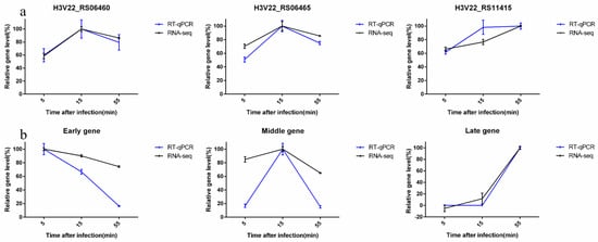 Three host TA system genes differentially expressed during infection and three phage genes belonging to cluster 1, cluster 2, and cluster 3, respectively, were selected to verify the transcriptome data with RT-qPCR. It was found that three bacterial TA system genes had the same expression pattern in the two methods (Figure 5a). Although the RT-qPCR results of H3V22_RS11415 at 15 min after infection were different from the data of RNA-seq, the expression trend of the two groups of data was consistent. In addition, we randomly selected phage genes belonging to different clusters for verification. The results showed that the RT-qPCR results were compatible with the data of RNA-Seq (Figure 5b).