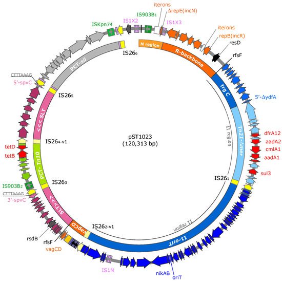Multilocus sequence type (MLST) of ST1023 was ST19. It was assigned using the PubMLST scheme for Salmonella spp. (https://pubmlst.org/; November 2021) with the following results: aroC10, dnaN7, hemD12, hisD9 and purE5 [21]. Similarity searches were performed using the BLASTN algorithm of the NCBI Web BLAST (https://blast.ncbi.nlm.nih.gov/Blast.cgi; March 2022) and the entire or selected regions of pST1023 sequence as query. Results were graphically depicted by SnapGene (http://www.snapgene.com/; November 2021) and Adobe Illustrator (https://www.adobe.com/it/; November 2021) Plasmid replicon type was determined using the PlasmidFinder v.2.0.1 (https://cge.cbs.dtu.dk/services/PlasmidFinder/; November 2021) [22,23]. ISFinder was used to identify complete or partial insertion sequences and mobile genetic elements (http://www-is.biotoul.fr; March 2022) [24]. Tandem repeats, period size and copy number of iterons were detected by Tandem repeats finder (https://tandem.bu.edu/trf/trf.html; March 2022) [25].