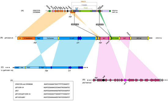 The mosaic plasmid pST1023. Shaded regions, with nucleotide identity ≥99%, are marked by colours. (A) IncR plasmids sharing the N region, R backbone, loci A and B. (B) Linear map of pST1023. The different regions that constitute the mosaic pST1023 are shown with coloured boxes. IS26 elements are in yellow. (C) Regions of IncI1 plasmids (such as pST1030-1A) shared with pST1023. (D) Regions of pSLT-derived plasmids shared with pST1023. (E) Sequences of rfsF sites are reported.
