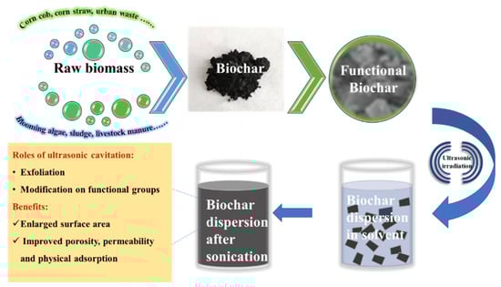 Equipment, the chemical environment, and parameters such as frequency and intensity have critical impacts on reactions promoted using ultrasound. However, researchers have not yet systematically investigated the effects of ultrasound frequency or intensity in biochar modification. This review summarizes the optimization work to date seeking better ultrasonic treatment conditions, which should help to improve biochar modification processing using ultrasound. The ultrasonic modification on biochar is demonstrated in Figure 2.