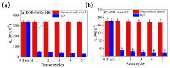 (a) Ultrasonic regeneration on Fe/Zn-loaded microporous loofah sponge biochar. Reprinted with permission from ref. [61]. Copyright 2021 Elsevier B. V. (b) Ultrasonic regeneration on Fe/Zn-loaded sugarcane bagasse biochar. Reprinted with permission from ref. [62]. Copyright 2021 Elsevier B. V.
