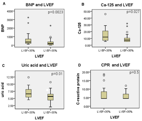 We observed that patients with LVEF of less than 35% had not only higher serum levels of BNP but also of uric acid and Ca-125. This data is presented in Figure 1.