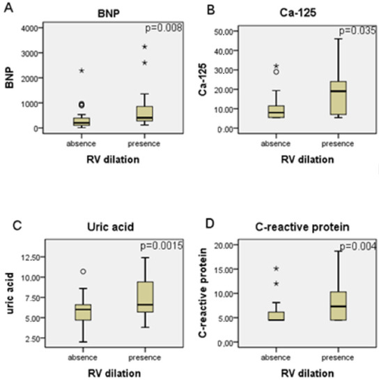 Patients grouped according to the presence of RV dilation on echocardiogram showed higher levels of BNP, ca-125, uric acid and C-reactive protein. This data is reported in Figure 2.