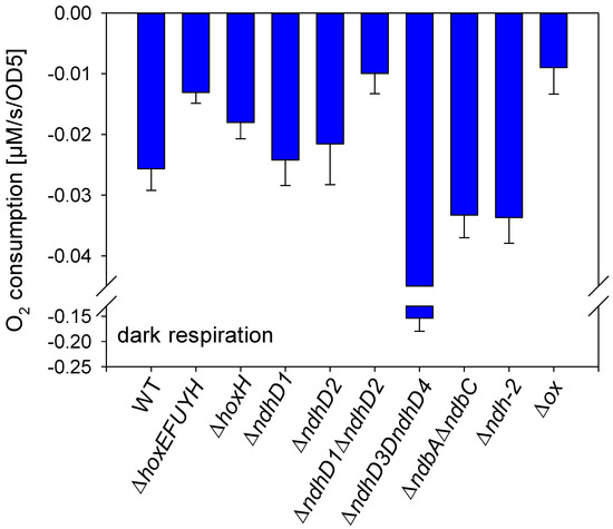 Dark respiration of different deletion strains of Synechocystis sp. PC 6803. Cell density was adjusted to the same OD750 and oxygen uptake measured for 5 min in the dark. The rate of oxygen uptake was taken from at least three different cultures of the same strain of the last 3 min. Error bars represent standard deviation.