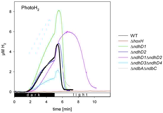 When comparing the different strains, it is important to note the ΔndhD1ΔndhD2 double mutant consistently shows a long phase of photoH2 production and the lowest rates of H2 uptake (Figure 3 and Figure S3).