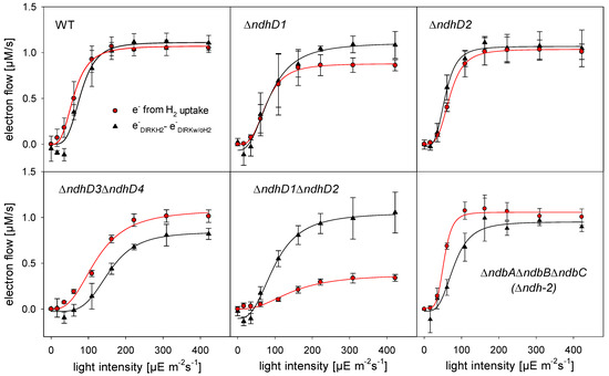 Parallel measurements of H2 consumption (by a hydrogenase electrode) and electron flow through PSI by DIRK (dark interval relaxation kinetics) measurements of different ndhD deletion strains and the deletion strain of the type 2 dehydrogenase (ΔndbAΔndbBΔndbC). The black triangles and the black lines indicate the increase of electron flow through PSI due to the addition of H2 and the red circles and red lines indicate the number of electrons generated by H2 oxidation. The rates are given as µM electrons/s at a cell density of OD750 = 5.7. The error bars indicate the standard deviation of at least three independent cultures.