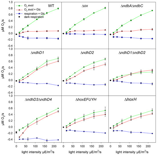 Here we made measurements of oxygen consumption in the light, without and after the addition of glucose, and of the electron flow through PSI. As shown in Figure 5, wild type cells and a number of deletion strains, including Δox without respiratory terminal oxidases; Δndh-2 without the type 2 dehydrogenases; ΔndhD1, without NDH-11; ΔndhD2 without NDH-12; ΔndhD1ΔndhD2 without NDH-11 and NDH-12; ΔndhD3ΔndhD4 without NDH-13 and NDH-14; ΔhoxEFUYH without any of the hydrogenase subunits; and ΔhoxH without the large hydrogenase subunit, were measured at different light intensities. In the experiment the cells were exposed to a specific light intensity for 1 min to reach a steady state. In the approximately 2 min following, changes in the rate of oxygen turnover were recorded and the electron transfer through PSI was determined by DIRK measurements. Subsequently, 10 mM glucose was added and after another 1.5 min under continuous light the oxygen and DIRK measurements were repeated.