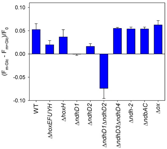 Parallel PAM-fluorescence measurements were performed for all the strains without and with glucose to monitor their putative state changes. By giving saturation pulses of high light, the excitation of PSII before and after glucose was measured. As visible in Figure 6, all the strains that show the increased oxygen consumption after the addition of glucose also show a state change and remove antenna from PSII (the Fm without glucose is higher), while all those that do not show this effect have a reduced state change or even have a negative value (ΔndhD1ΔndhD2) that indicates that more excitation energy is funneled into PSII.