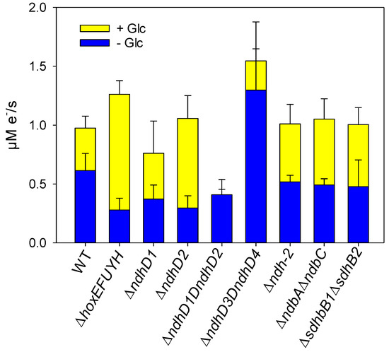 Because the PQ pool is strongly oxidized under these conditions and the electron flow through PSI is much smaller than when PSII is active [28], ferredoxin 1 could be an electron donor to the NDH-1 complexes. This would also explain why the ΔhoxEFUYH mutant is able to increase its electron flow after the addition of glucose since the FNR could replace the diaphorase and work in reverse, as previously discussed concerning the respiration measurements.