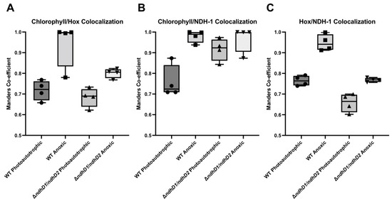 Spatial analysis of Hox, NDH-1 and chlorophyll distribution in cells grown photoautotrophically at 30 µmole photons m−2 s−1 and following anoxia. The distribution of Hox relative to photosynthetic pigment (A), The distribution of NDH-1 relative to photosynthetic pigment (B), and the distribution of Hox relative to NDH-1 (C). Box plot displays the minimum and maximum Manders coefficient values with individual data points. Data represent four biological replicates: WT photoautotrophic n = 898, WT anoxic n = 1010, ΔndhD1ΔndhD2 photoautotrophic n = 912, ΔndhD1ΔndhD2 anoxic n = 750.